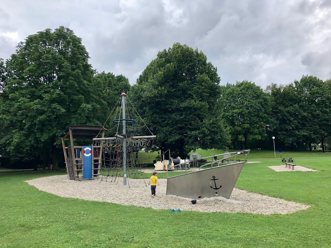 Weiter ging die Fahrt in den Thermal-Ort Bad Füssing. Wir parkten auf dem großen Privatparkplatz hinter der Pizzeria Abruzzo. Dort gönnten wir uns ein üppiges Mittagessen. Anschließend spazierten wir in den Park, der mit einem tollen Piraten-Spielplatz aufwarten konnte. Auf dem Rückweg bestellten wir uns einen Kaffee im modernen Café O‘ La La des Hotels Wittelsbach.