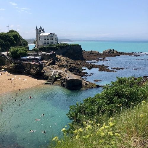 - Wir besichtigten den windigen Strandort Biarritz. Unser Spaziergang führte uns an den Stränden Plage de la Côte des Basques und Plage du Port Vieux entlang. Unterwegs kamen wir an der Felsformation Rocher de la Vierge vorbei.