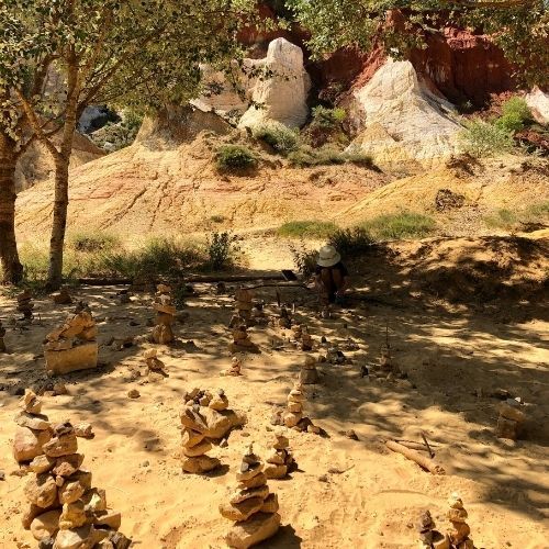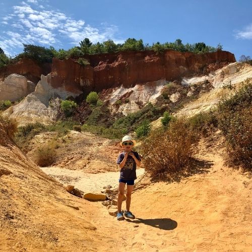 Achtung: auf der Wanderung durch die äußerst sehenswerte Wüstenlandschaft mit rötlichen Felsformationen und einstige Ockergruben können sich Kleidung und Schuhe verfärben. Dunkle Crocs und dunkle Kleidung waren bei uns eine gute Idee.
