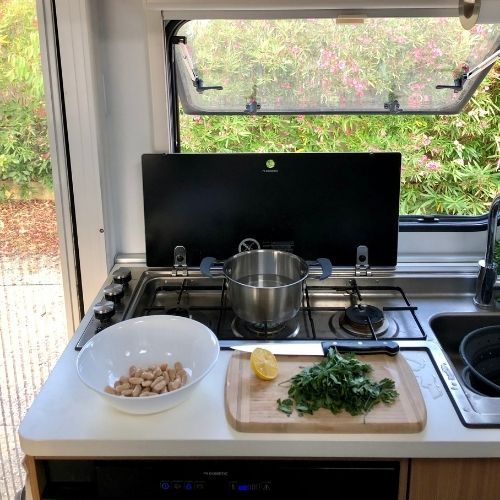 Während dieser Reise bereiteten wir häufig sommerliche Rezepte aus meinem Wohnmobil Kochbuch zu. Das Kochen während unseren Wohnmobiltouren ist spontaner und minimalistischer als zu Hause. Ich habe über meine Kocherfahrungen ein Camping Kochbuch geschrieben. Es heißt Smarte Camper Küche und du kannst es auf Amazon kaufen. Ich verrate darin unsere Lieblingsrezepte und Tipps & Tricks rund um das Kochen auf kleinstem Raum. Gerade auf Roadtrips ist dieses Kochbuch viel wert.