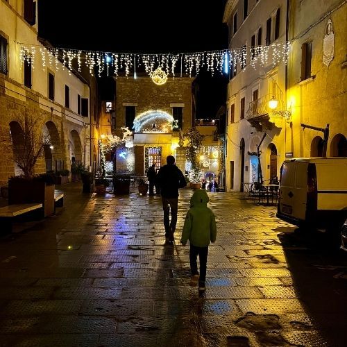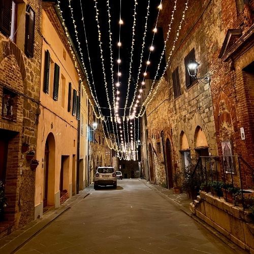 - Auf Manfredos Tipp hin, sind wir glücklicherweise nicht direkt an die Küste, sondern für eine Nacht nach Radicondoli gefahren. Die Hauptstraße war wunderschön beleuchtet. Der steile Anstieg vom Stellplatz in die Altstadt ist sportlich, war aber gut machbar. Für einen Abendspaziergang und zum Pizza holen lohnt sich ein Aufstieg definitiv.
