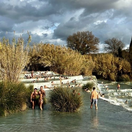 Saturnia ist ein Thermalort mit kostenlosen, natürlichen Sinterbecken. Wer mag, findet in der Nähe auch ein kostenpflichtiges Wellnessresort mit gemauerten Wasserbecken, Anwendungen und mehr Komfort. Die Quellen von Saturnia sind seit der Antike bekannt und wurden von den Römern wegen ihrer therapeutischen Eigenschaften geschätzt. Das himmelblaue, warme, mineralhaltige Wasser der Quellen enthält Schwefel und andere Mineralien, die für ihre heilenden Wirkungen auf Haut, Muskeln und Gelenke bekannt sind. Bei unserem Besuch im Winter haben wir keinen Schwefelgeruch wahrgenommen und unsere Badekleidung hat sich nicht verfärbt. Die Wassertemperaturen liegen zwischen 37 und 42 Grad. Wir konnten uns im Wasser sehr gut entspannen und uns lange darin aufhalten. Die umliegende Landschaft lädt dazu ein, den Blick zu schweifen und die Seele baumeln zu lassen.