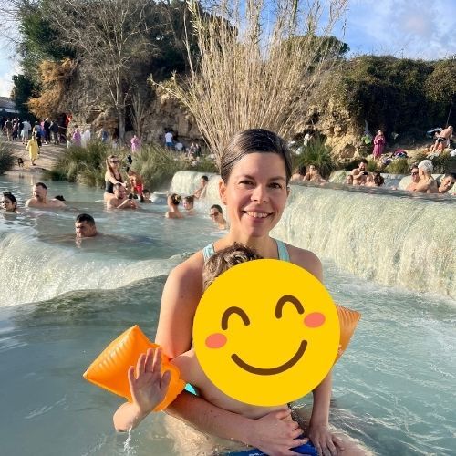- Zum Aufwärmen steuerten wir die öffentliche Therme von Saturnia, genannt Cascate del Mulino, an. Wir parkten auf dem kostenpflichtigen Wohnmobilstellplatz von Saturnia und liefen rund 20 Minuten zur heißen Quelle. Erwachsene, Kinder und Hunde genossen gemeinsam das warme Wasser. Vor Ort kann man mit Duschmünzen duschen und bei Bedarf Snacks kaufen.