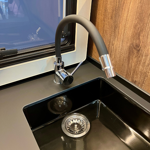 - Flexibler Wasserhahn und modernes Abflusssieb