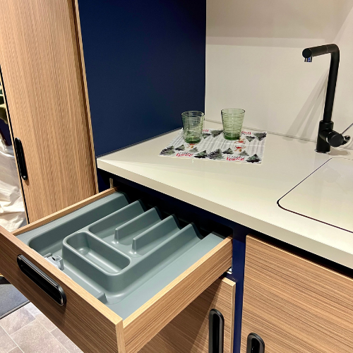 Mein Fazit: In dieser Küche habe ich mich sofort wohlgefühlt. Links neben dem 2-flammigen-Herd würde ich mir die Lebensmittel bereitstellen. Herd und Spüle ließen sich ganz entspannt mit einem Handgriff öffnen und wieder abdecken. Der Wasserhahn wirkte hochwertig. Mit der umständlichen Schublade könnte ich Leben, weil der Rest gut passt.