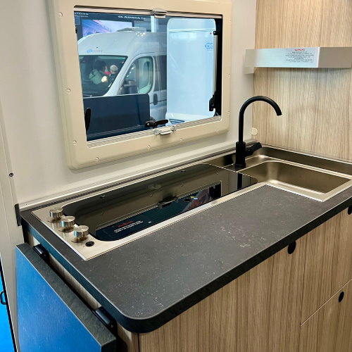 Die Küche ist direkt neben der Wohnmobiltür eingebaut. Kochfeld und Spüle sind (wie in unserem Sun Living A 60SP) eine verbundene Einheit und lassen sich dadurch meiner Erfahrung nach gut putzen.